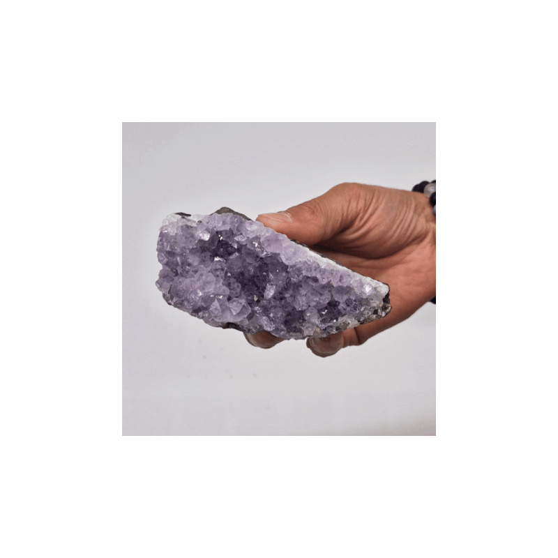 Este magnífico racimo de ametista natural, com peso entre 350 e 450 g e dimensões de 7,5 a 10 cm, destaca-se pelo seu brilho e cor intensos.
