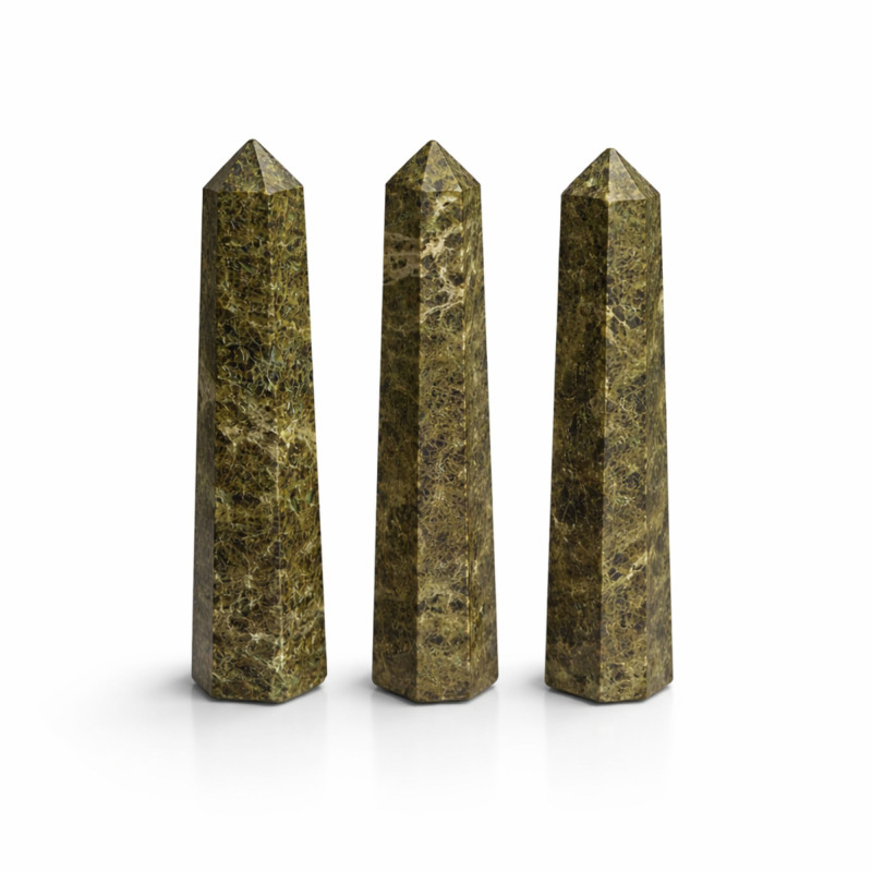 Tonos verdes profundos y patrones naturales hacen de este Epidote Six Face Obelisk Point una adición distintiva para cualquier espacio. El acabado pulido y la forma de seis caras destacan el carácter único de la piedra, creando un atractivo decorativo que llame la atención para escritorios, estanterías o zonas de meditación.
